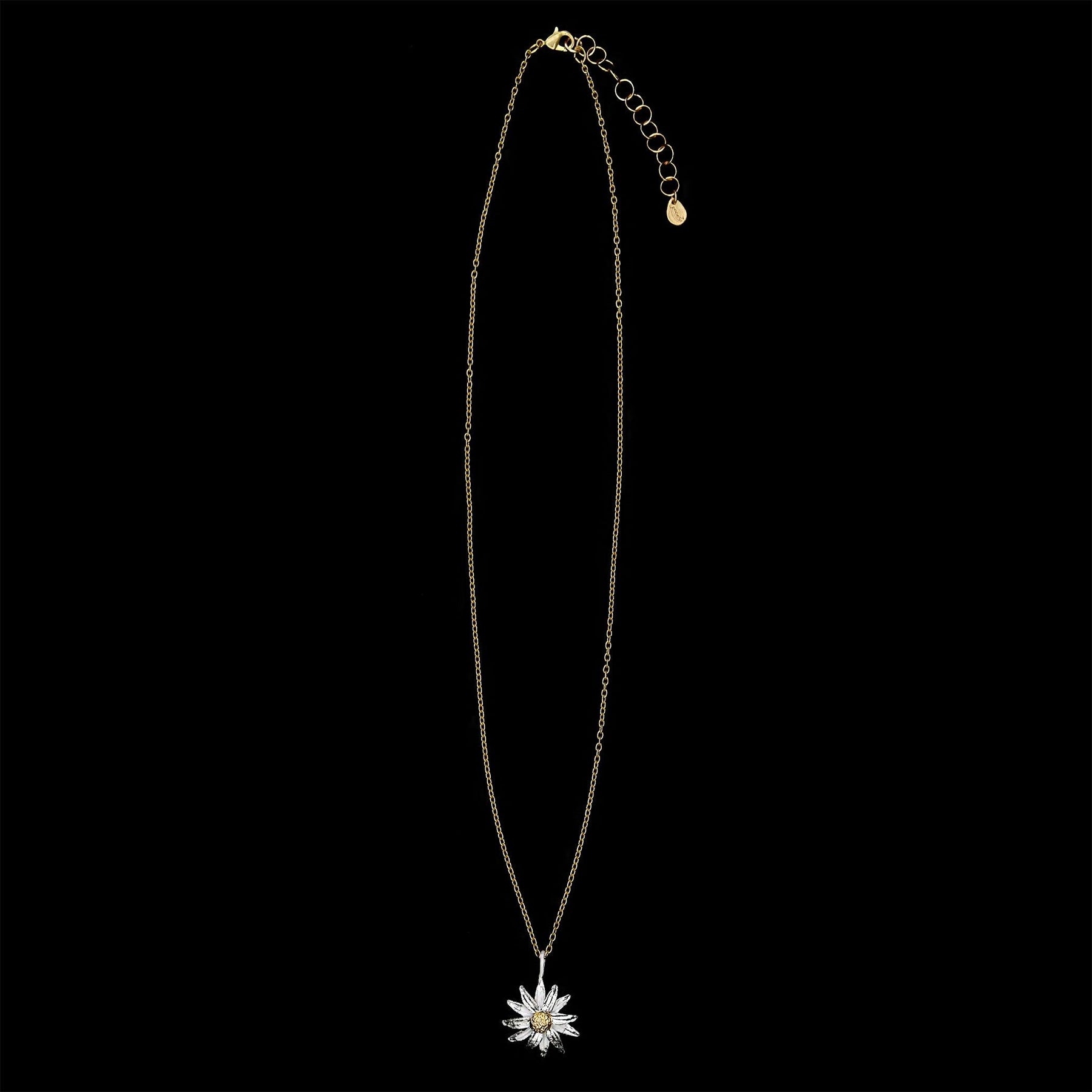 白のエナメルを施したブロンズに、柔らかく輝くゴールドのセンターを配し、花びら一枚一枚にホワイトゴールドリーフを重ねた仕様。表面は均一に光るのではなく、花弁の縁に沿ってやわらかく光が立ち上がります。約2.5cm × 約1.9cmのサイズは遠目でも輪郭が崩れず、近づくとエナメルの滑らかさと金属の陰影が分かれます。重さは軽やかで、日常に取り入れやすいバランスです。