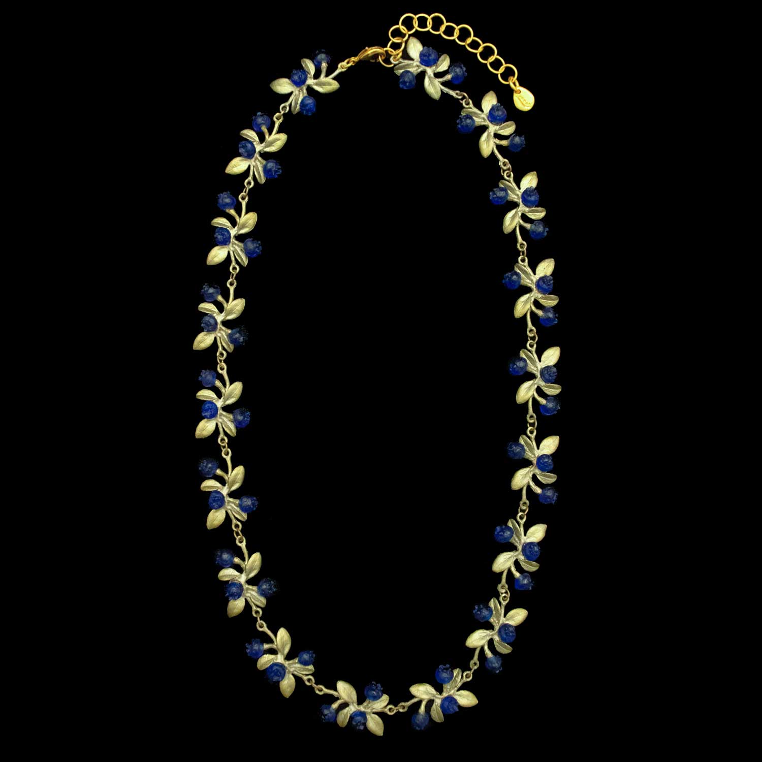 素材: 〈Petite Blueberry Necklace〉は、葉と枝を手作業でグリーンのパティナ仕上げを施したブロンズで鋳造し、深いブルーのキャストガラスで形づくられたベリーをアクセントに添えています。