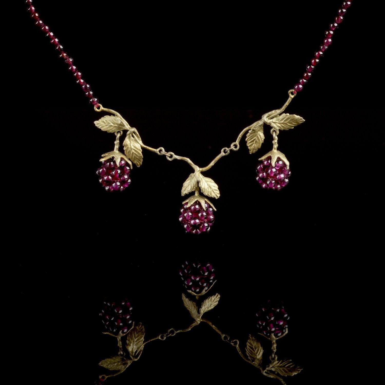 素材: 〈Raspberry Necklace〉は、ブロンズでかたどったラズベリーの葉と、3つのガーネットの実をあしらったデザイン。チェーン部分にもガーネットビーズを連ね、深みのある赤が胸もとに優雅なアクセントを添えます。